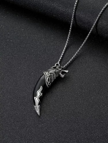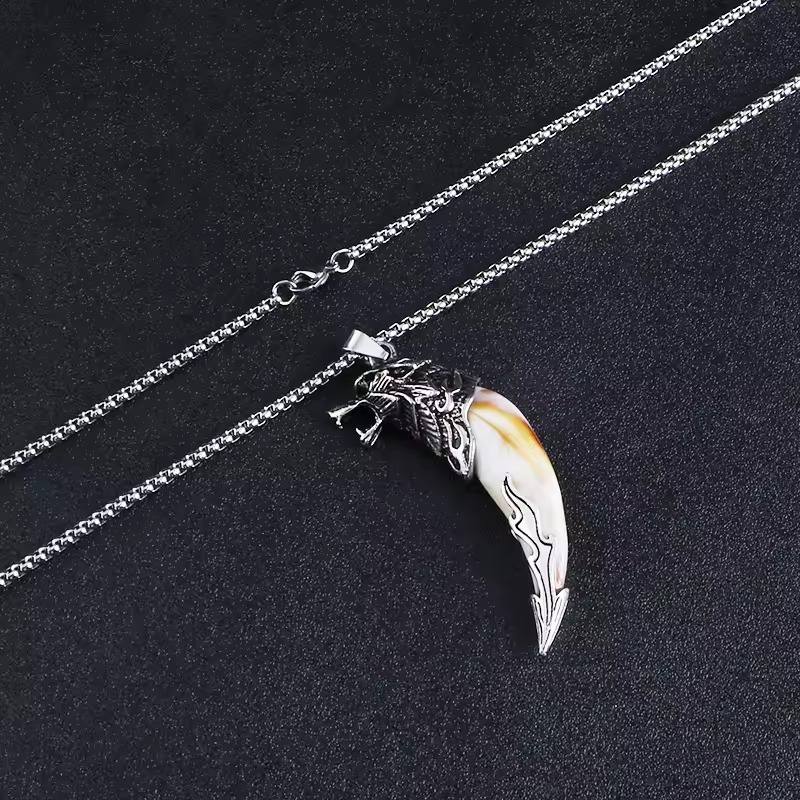 Colmillo de lobo tallado con detalles vikingos + cadena resistente.
